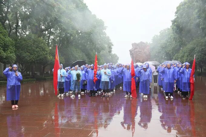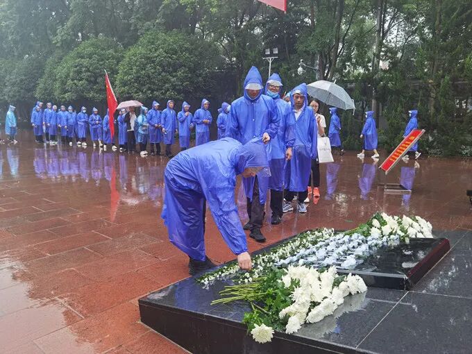 革命烈士纪念碑前,细雨蒙蒙,草木含悲。全体人员列队肃立默哀,向革命烈士敬献鲜花、行三鞠躬。面对庄严的党旗,全体人员坚定地举起右手,重温入党誓词,并齐声同唱《没有共产党就没有新中国》,表达对革命先烈的缅怀之情,感悟先辈们为共产主义事业奋斗终身的崇高精神。